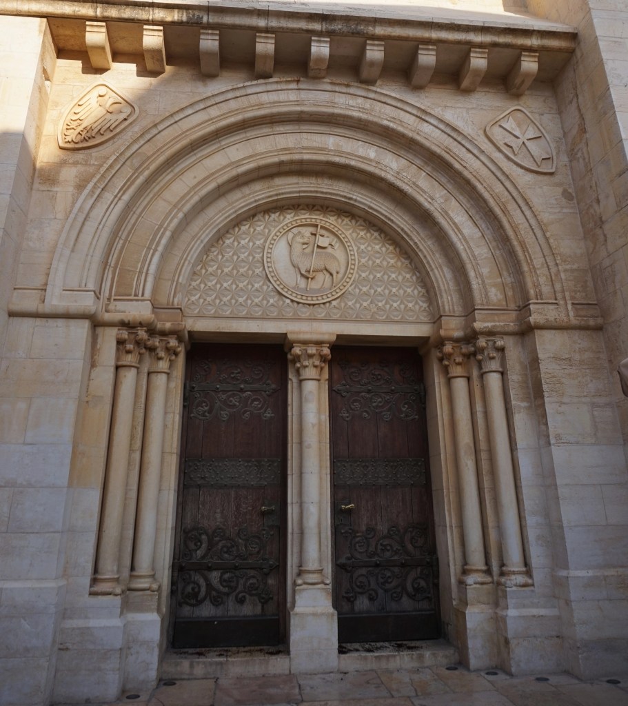 Die Erlöserkirche in Jerusalem hat Kaiser Wilhelm II. 1893-1898 für die deutschsprachige evangelische Gemeinde erbauen lassen. Sie wurde im neoromanischen Stil teilweise auf dem Grundriss einer mittelalterlichen Kirche errichtet. Das Westportal wird geschmückt vom Lamm Gottes, dem Wappen der Hohenzollern und dem Wappen der Johannitern. Tipp: wenn ihr euch das Foto vergrößert könnt ihr den üppigen und schönen metallenen Türbeschlag erkennen.