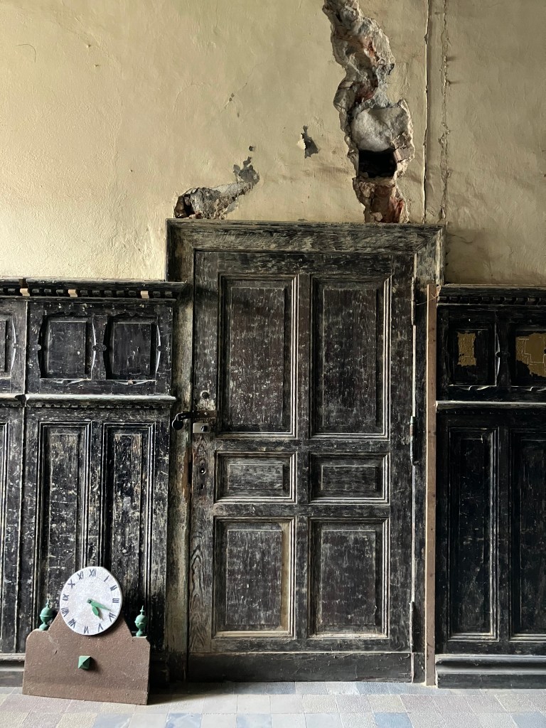Am ersten Adventssonntag haben wir die Außentür von Schloss Demerthin gesehen. Auch im nicht-sanierten Inneren lassen sich viele Renaissance-Details entdecken. In einem mittig gelegen Raum im EG, vielleicht früher so etwas wie eine Eingangshalle, befindet sich diese Tür samt eingebauter Zarge in die aufwändig gestaltete Wandverkleidung. Die Uhr daneben verleiht in diesem unsanierten Schmuckstück Schloss eine besondere Stimmung fürs Foto. Sie ist Teil der vielfältigen Sammlung von Alltagsgegenständen für ein Heimatmuseum, die der ansässige Verein dort aufbewahrt und ausstellt.